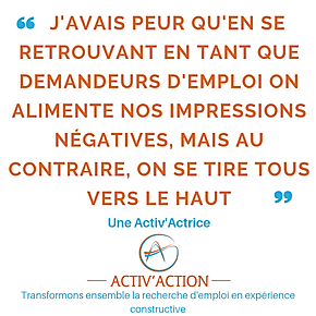 Activ'Action permet à chacun de transformer sa période de recherche d'emploi en une expérience constructive, propice au développement de nouvelles compétences savoir-être et à la réalisation d'un projet professionnel épanouissant.