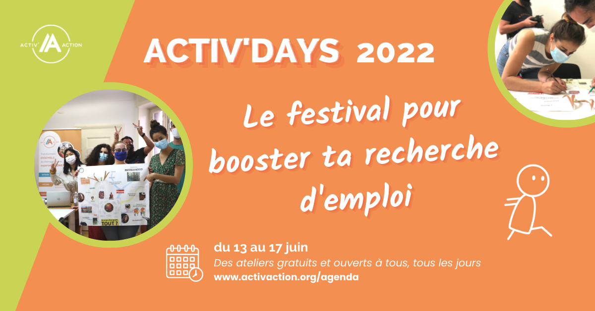 Du 13 au 17 juin, Activ’Action organise les Activ’Days : le festival pour booster sa recherche d’emploi ! Une semaine d'ateliers inédits, gratuits, collaboratifs et ouverts à tous, pour cultiver ses compétences savoir-être et rencontrer du monde, le tout, dans une ambiance conviviale !
